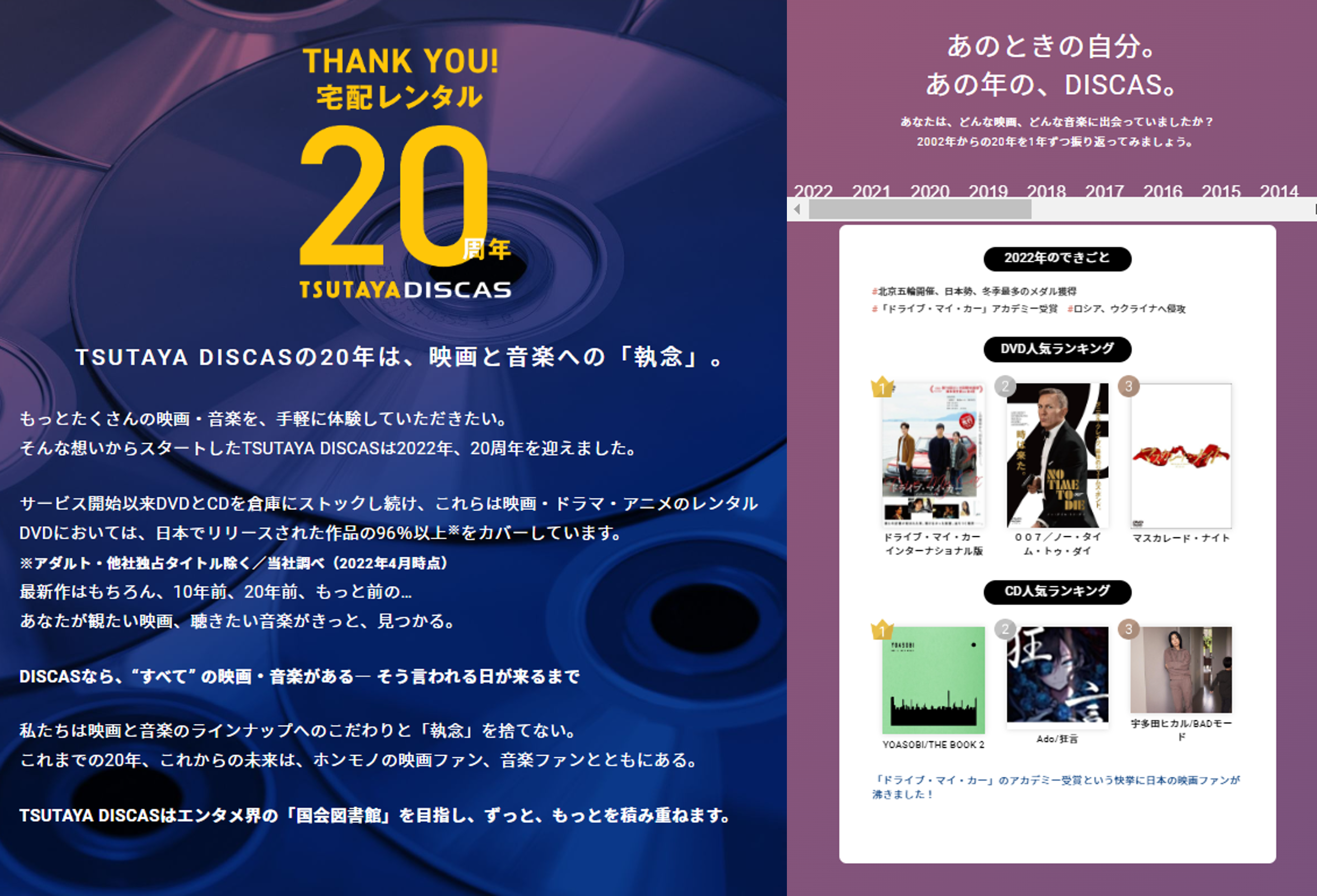 今年、ネット宅配レンタルサービスのTSUTAYA DISCASは20周年を迎えます。