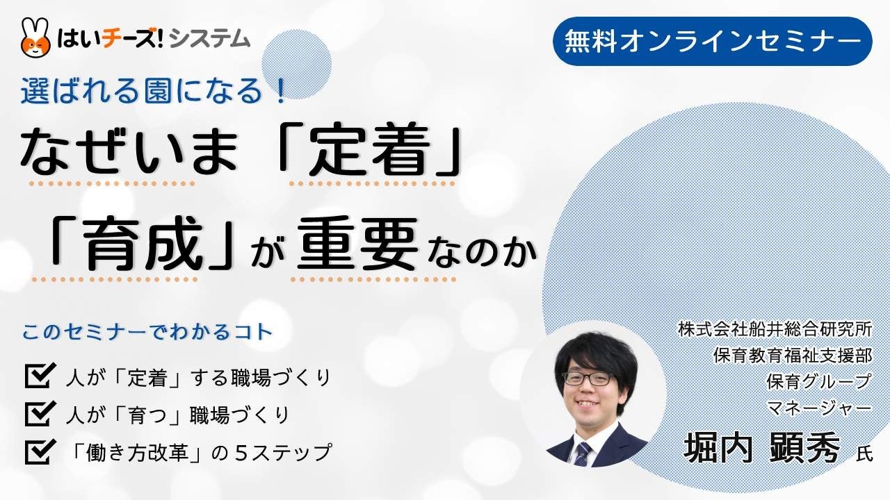 今回のオンラインセミナーでは、株式会社船井総合研究所の堀内氏を講師にお招きし、保育士が「定着」する職場づくりについて人間関係の改善事例から収支状況や仕事内容の見直し方法、また人が「育つ」流れについて採用場面から職務分掌の作成方法、そして「定着」や「育成」が出来る園の未来像についてお話しいただきます。