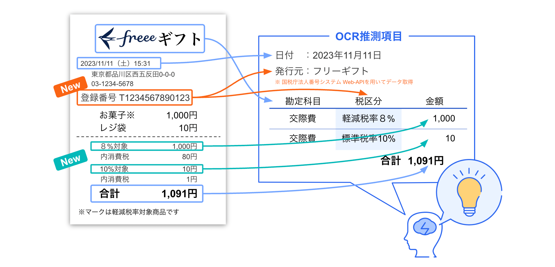 日付・金額・勘定科目だけでなく適格請求書発行事業者公表システム Web-APIを用いて税区分及び発行元のOCR自動推測を行います。
