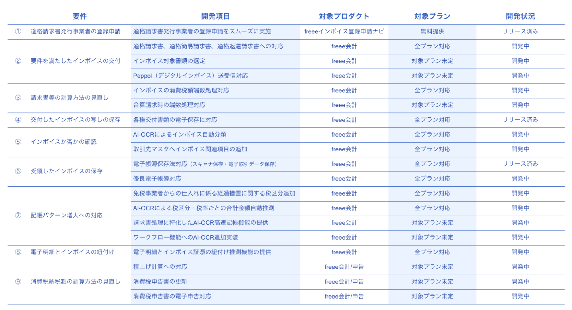 freeeでは“これだけ”でインボイスに完全対応できるよう2023年10月までに各種項目の開発を行う方針です。