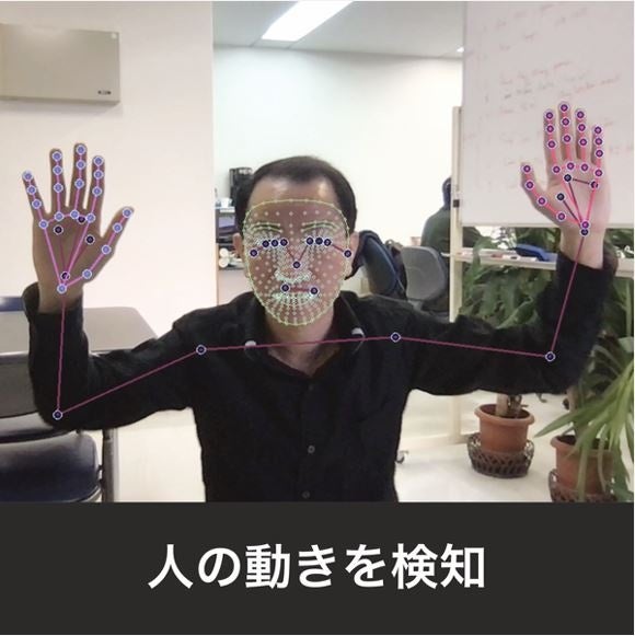 人体の関節の動きを検知し、人の動きを見える化。 カメラが手の動きを検知し画面上のキャラクターを操作する体感型ゲームAIや、スポーツにおける運動性能向上サポートも可能。また介護の場面においては転倒の可能性を検知する等、利用方法は無限大!