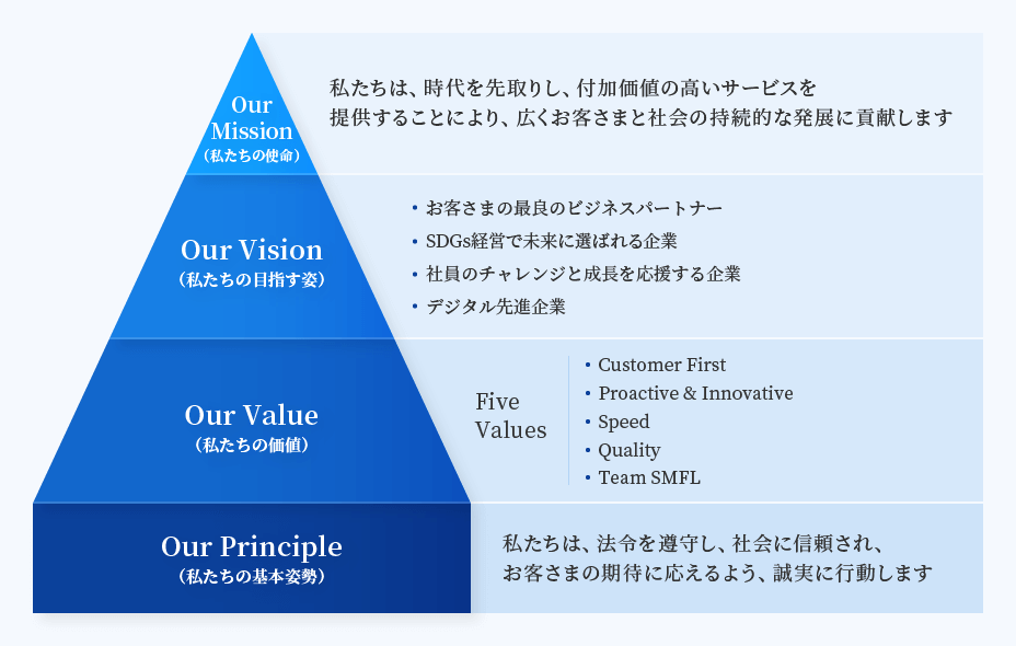 2020年4月、SMFL社はこれまでの経営理念や経営方針を再定義した「SMFL Way」を制定し、その中で 「Our Vision(私たちの目指す姿)」の一つとして、『社員のチャレンジと成長を応援する企業』を掲げました。