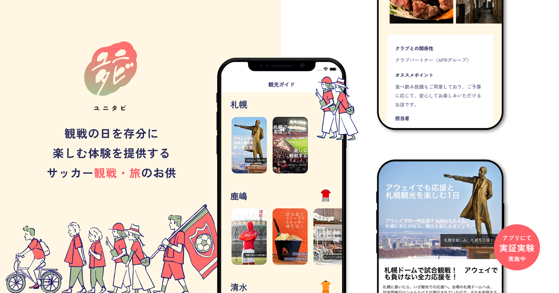 「ユニタビ」は、「ユニ着て旅する」をコンセプトに、観戦・旅のお供となって、観戦の1日を存分に楽しむための情報を提供するアプリです。スタジアム観戦を行う1日を「旅」と捉え、試合の前後もユニフォームを着て街を歩き、観光地巡りや食事を楽しんでいただくことを目指します。「Jリーグチケット」で購入した観戦チケットの情報を本アプリに登録していただくと、その試合が開催されるスタジアムを訪れる際に参考になる、アクセス情報や周辺の飲食店や観光ガイド、選手やサポーターが利用する飲食店など、地元ならではの情報を確認することが可能です。また、10月からはアプリ内に掲載されているおすすめスポットを巡ってポイントをためると、選手のサイン入りクラブグッズや地域の名産品がもらえるスタンプラリーも開催予定です。