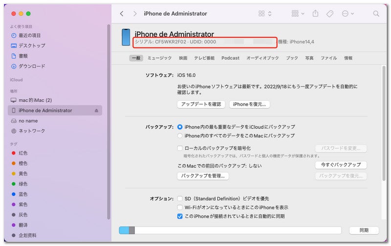 方法3:FinderでiPhone/iPadのUDIDを確認する【Mac】