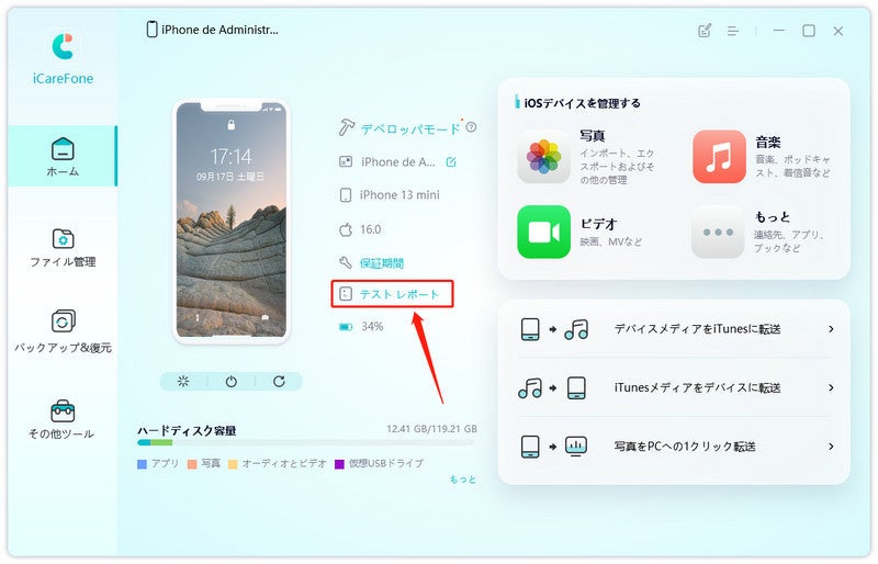 手順1:iCareFoneを起動します。アプリの中央画面にある「テストレポート」をクリックします。