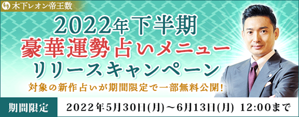 フジテレビ系列で放送中の占い番組『突然ですが占ってもいいですか?』で人気を博している木下レオン。この度、月額公式サイト『木下レオン◆帝王数』にて、『木下レオン帝王数 2022年下半期 豪華運勢占いメニュー リリースキャンペーン』を公開いたしました。キャンペーン期間中、2022年下半期の運勢鑑定が一部無料で鑑定可能です。ぜひこの機会にお試しください。