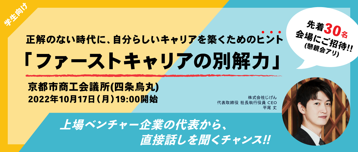 株式会社じげんは、サステナビリティの重点項目のひとつとして掲げている「地域社会の創生」への取り組み第2弾として、京都に新たな拠点「じげん京都オフィス」を開設し、学生を中心としたオフィスとして2022年4月より稼働しています。このたび、新拠点を構える京都にて、当社代表の平尾丈による学生向けオフラインイベントを初開催いたします。
