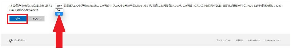 5.本人確認後、アカウントを削除する準備の画面が表示されますので、マイクロアカウントを削除するまでの日数を30または60日間から選び、「次へ」をクリックします。