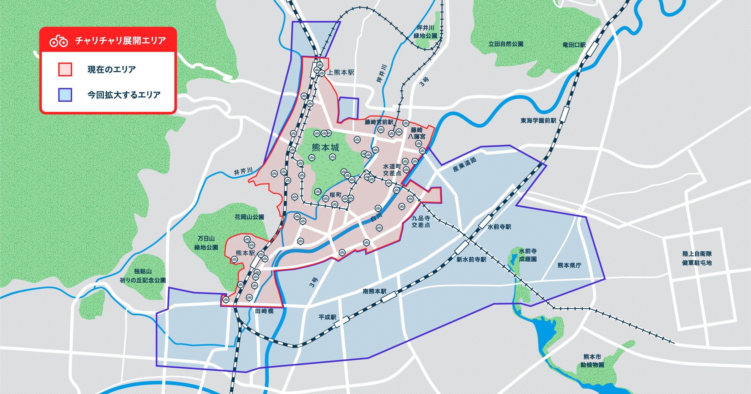 具体的には、現在のエリアの南側においては、公共交通利用者の多い、JR豊肥本線の沿線や水前寺地区、大江地区などを含む区域、北側は上熊本駅の周辺エリアを拡大し、利用エリアは、約630haから約1,950haへと約3倍に拡大しました。