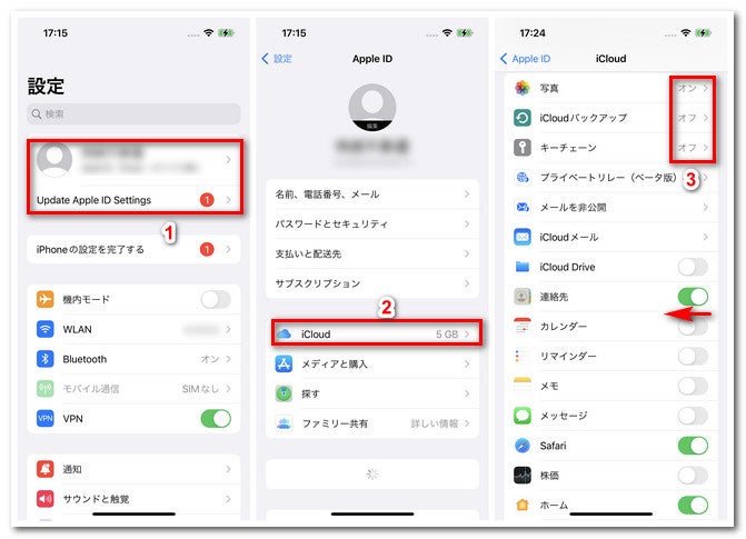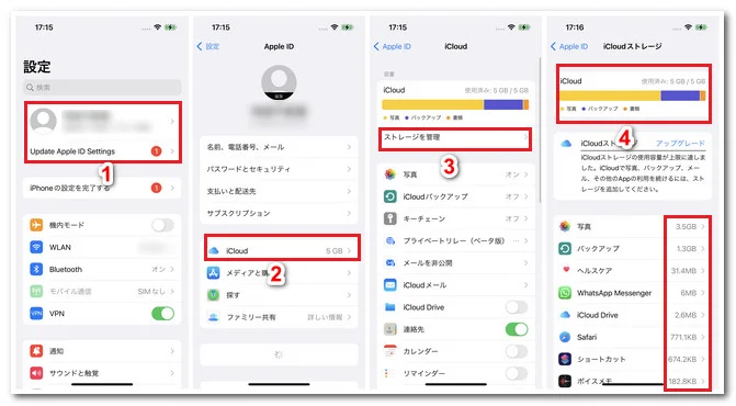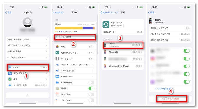 方法1:iPhoneなどのデバイスを使ってiCloudバックアップから要らないデータを削除する