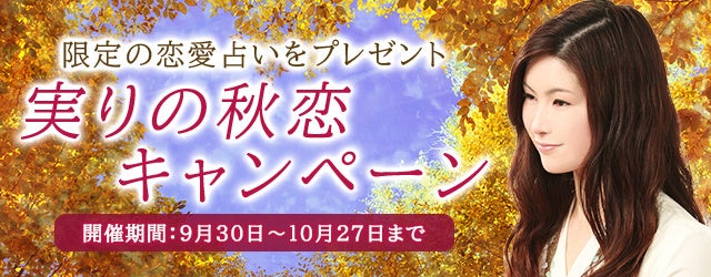 秋といえば、読書の秋、芸術の秋と言うように、その過ごしやすさから、一人でいろんなことに打ち込むのに絶好の季節ですが、実は恋愛が始まりやすく長続きしやすい季節でもあります。そこで真木あかりの公式占いサイトでは、あなたの恋愛が進展しますように『実りの【秋恋】キャンペーン』を開催中です。期間中は対象鑑定をご購入の方全員に、キャンペーン限定の恋愛占いをプレゼントいたします。この機会にぜひ「真木あかりの占い」であなたの恋愛に関する悩みや不安をすっきりさせましょう。