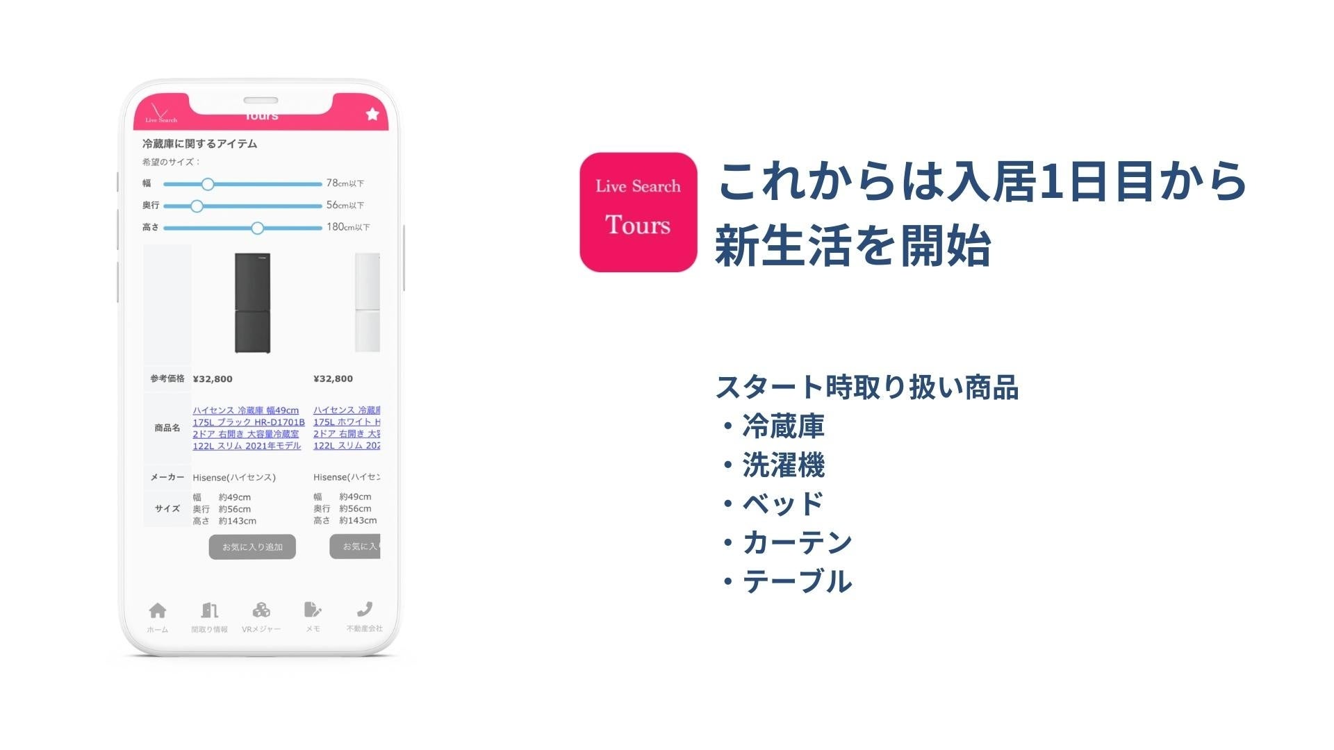 当機能では、ECサイトと連携し、気になる家具・家電商品サイズ情報の確認や、縦横高さのサイズ絞り込みなどが可能となり、引っ越し前の家具・家電購入をスマホで完結できる機能となります。