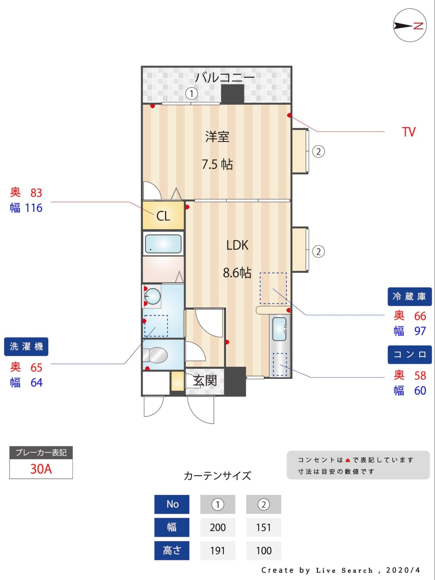 Toursでは物件の間取り図情報も確認できます。Live Searchが提供する間取り図ではカーテンサイズ・冷蔵庫置き場サイズ・冷蔵庫置き場サイズ・収納サイズ・コンセントの位置などの室内情報を実測で計測し、表記しております。