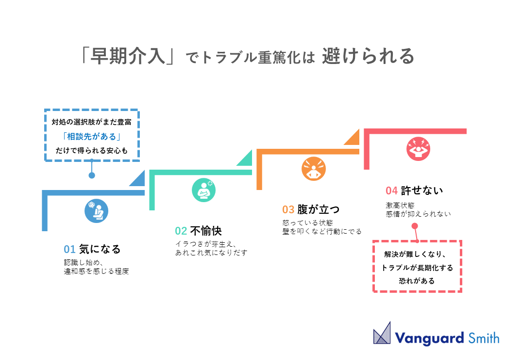 一度「許せない」という感情まで振り切ってしまうと、対策を講じても相手に不信感・嫌悪感を覚えてしまうため解決が難しくなり、トラブルが長期化する恐れがあります。