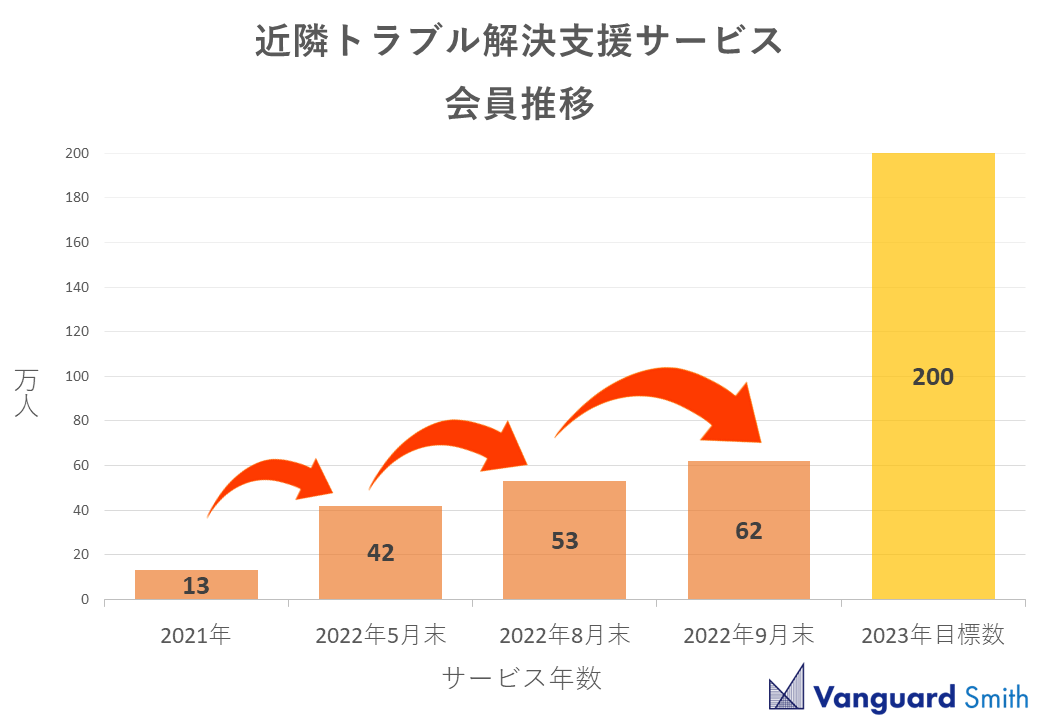 当社主要事業として展開している「近隣トラブル解決支援サービス」は、2016年のサービス開始から6年で、会員数は全国約62万人(2022年9月末現在)に上っています。直近では2022年8月末から約1.2倍と急増しています。