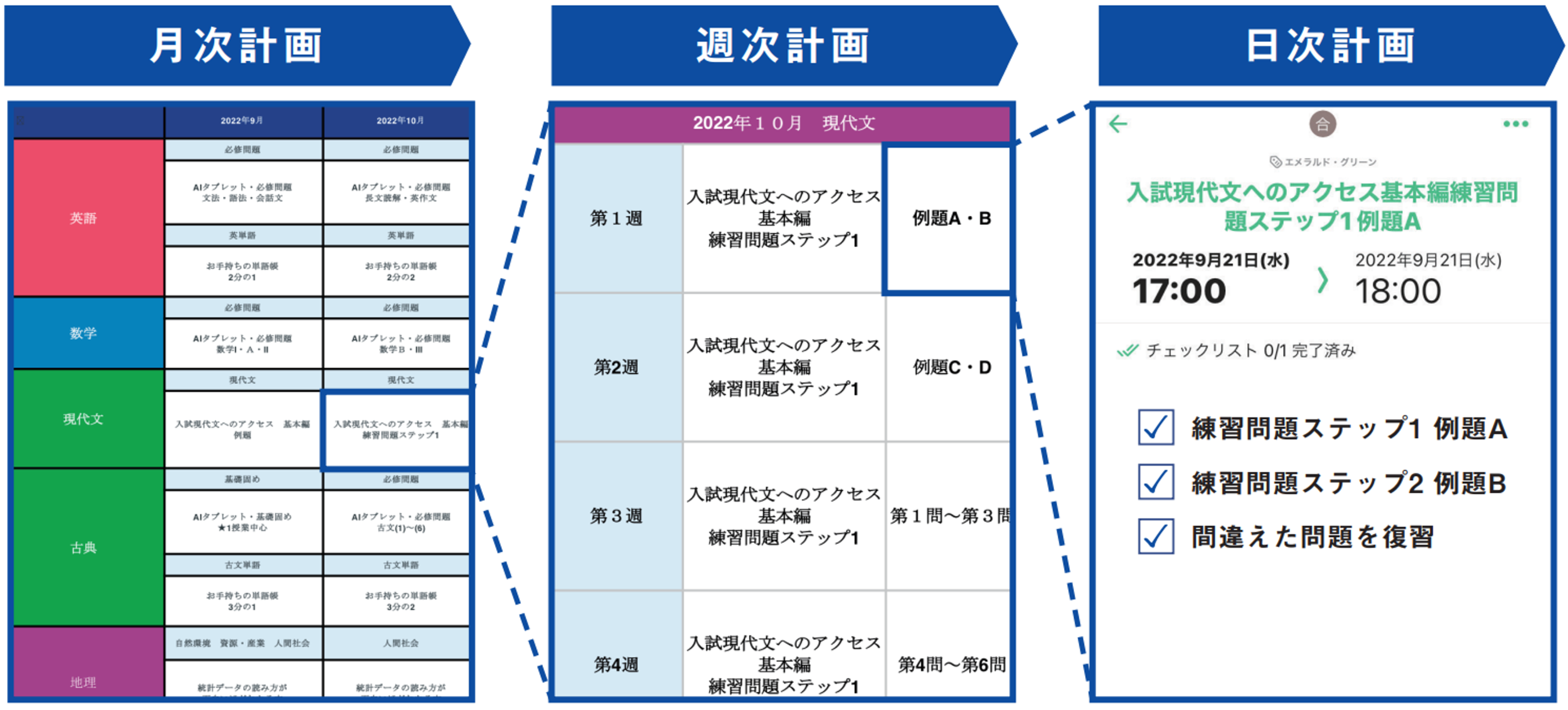 - ポイント① 緻密な学習計画 毎月・毎週だけでなく毎日のやるべきことが明確になる