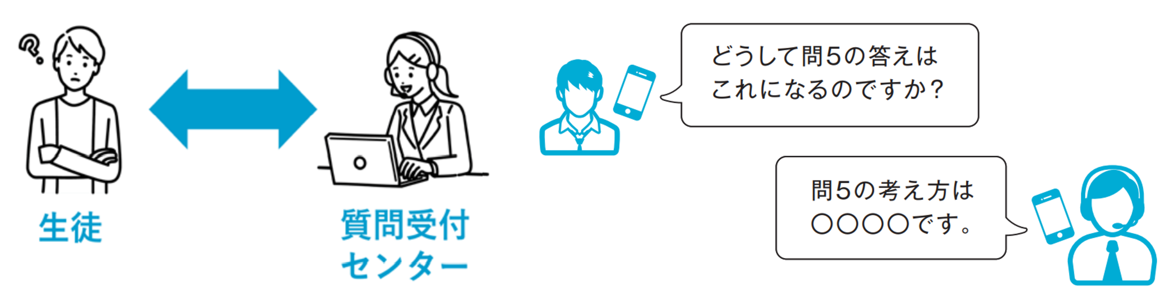 自宅や通学時などで自習をしている時にわからない問題が出てきたら、チャットツールを用いて質問受付センターへ質問することができます。質問受付センターのスタッフは、難関大の現役学生や卒業生です。だから、難関大に特有なハイレベルな問題でもわかりやすく解説できます。