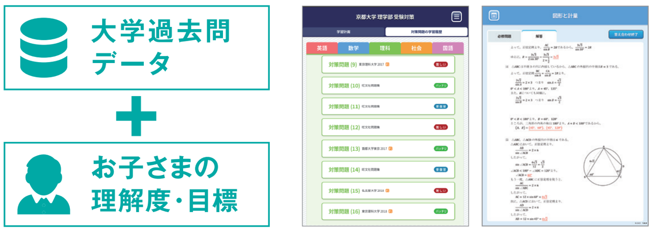 過去問対策も戦略的・効率的に行います。「入試問題的中AI」が志望校合格に必要な演習問題50問を厳選し、生徒はそれに沿って解き進めます。入試問題的中AIは、191大学過去5年分の入試問題を解析し、その生徒が本当にやるべき問題を提示します。生徒は志望校や各科目の“理解度”を設定することで、自分のレベルに合う精度の高い演習問題だけに取り組むことができます。