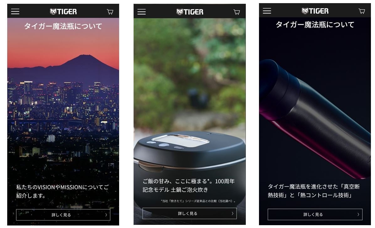 従来の企業・製品情報サイトと公式オンラインショップを統合した新公式サイトにより、お客様に当社の想いや製品コンセプトをより深くお伝えし、共感いただいたうえでタイガーの製品を選び、ファンになっていただきたいと考えております。また、スマートフォンでの使いやすさにも徹底的にこだわり、当社の考える価値をイメージやビジュアルで直感的にもお届けするUI/UXを採用しました。