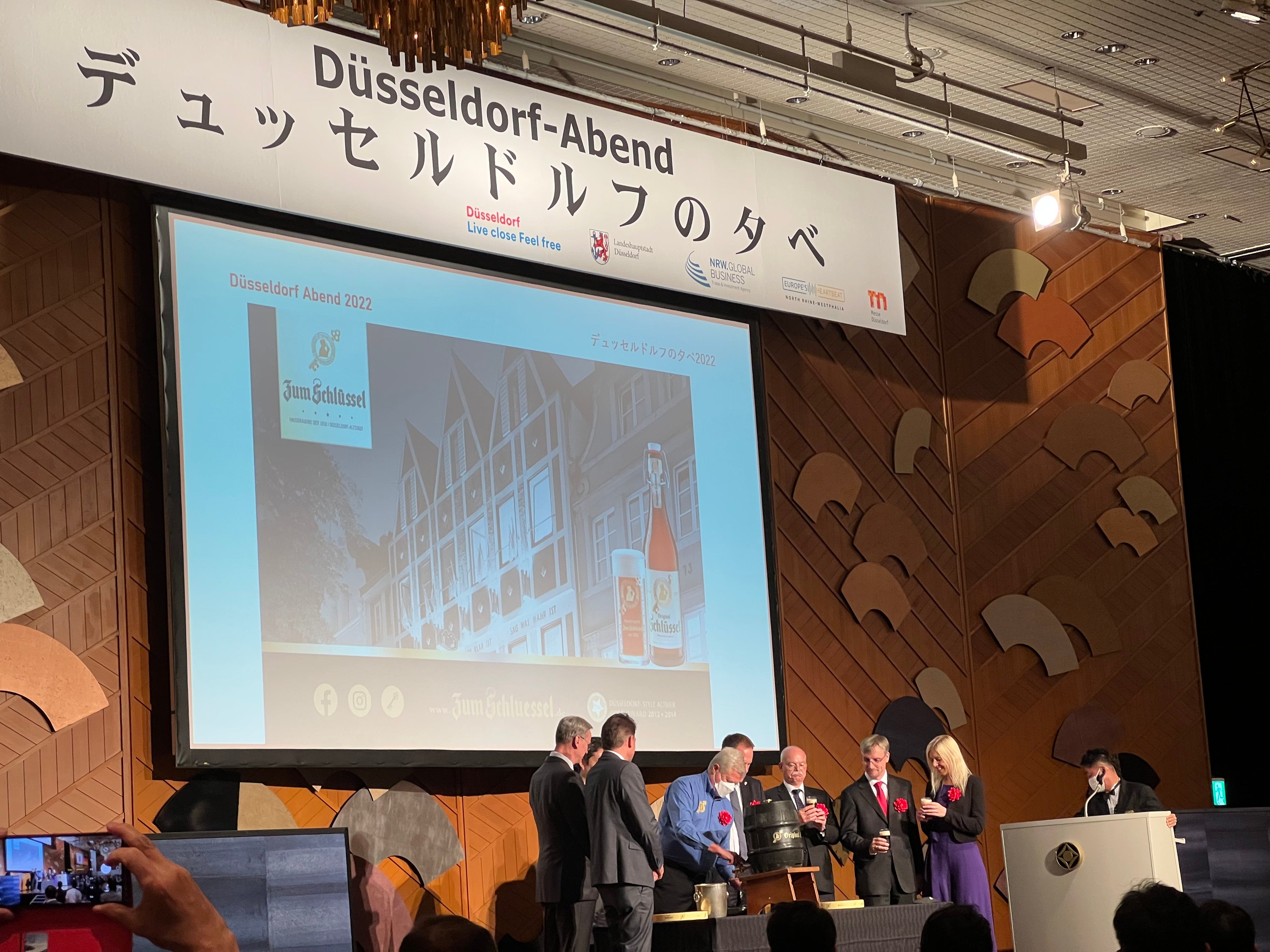 デュッセルドルフの夕べは、デュッセルドルフ市とノルトライン・ヴェストファーレン州に拠点を置く日系企業の皆様が集う交流会です。日本の企業や団体は通常、社員または職員を海外の現地法人に駐在員として数年間派遣します。そのため、日本人の従業員がデュッセルドルフで生活する期間は限られており、彼らが日本に戻ってからも、かつての「デュッセルドルフの日本人」とつながりを維持しようと、1981年にデュッセルドルフの夕べと銘打った交流会を発足し、今では3年に1回のペースで開催されています。コロナ禍前において約1,000人以上が集うこの交流会は、旧交を温めたり新しい人脈を形成したりする場になっており、日本で最も重要な独日ネットワークイベントの一つです。