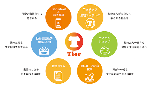 お気に入りの動物がいたらTierチップを贈ったり・里親探し・迷い犬(猫)などの情報・動物病院の情報検索・アイテムショップなど、動物に関するあらゆる情報を詰め込んだSNSとなる予定です。