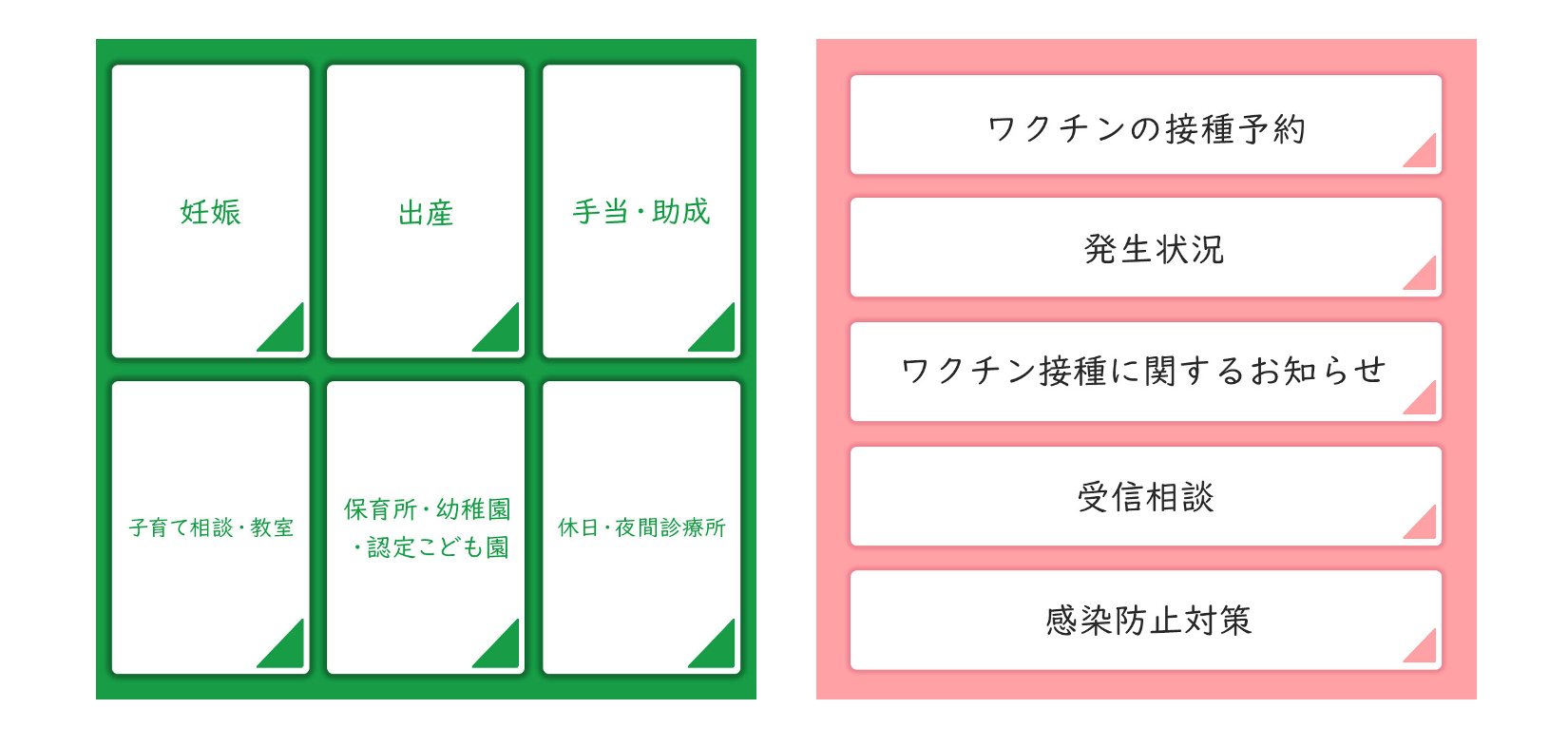 各種リッチメニューから選択しやすいように、カードタイプで調べたい内容を記載いたしました。直接、カードタイプのメニューをクリックすると、調べたい内容のページに移行できます。