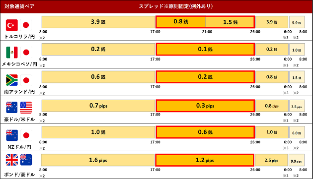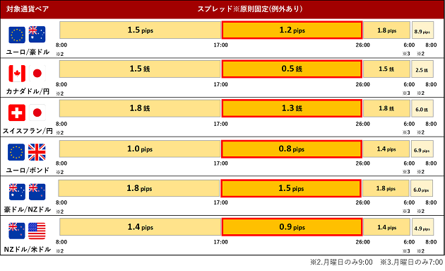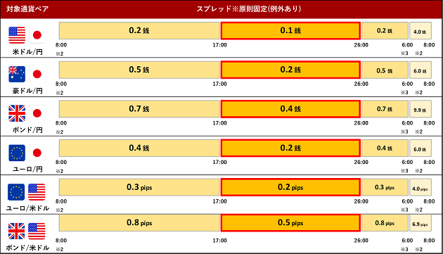 ※1.主要経済指標発表時等の急変時、国内外の休日や平日早朝など著しい流動性低下時はやむをえずスプレッドを拡大する場合がございます。 メンテナンス時間(火曜日~金曜日 各日5:55~6:10、土曜日5:50~月曜日7:00)は適用時間に含まれません。