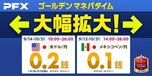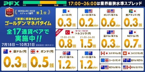 株式会社 マネーパートナーズ(代表取締役社長:福島秀治、本社:東京都港区、以下「当社」)は、17時~26時を『ゴールデン マネパタイム』とし、全17通貨ペアで業界最狭水準スプレッドを提示するキャンペーンを継続いたします。原則固定(例外あり)