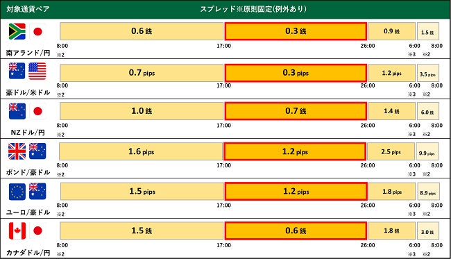 ※1.主要経済指標発表時等の急変時、国内外の休日や平日早朝など著しい流動性低下時はやむをえずスプレッドを拡大する場合がございます。 メンテナンス時間(火曜日~金曜日 各日5:55~6:10、土曜日5:50~月曜日7:00)は適用時間に含まれません。