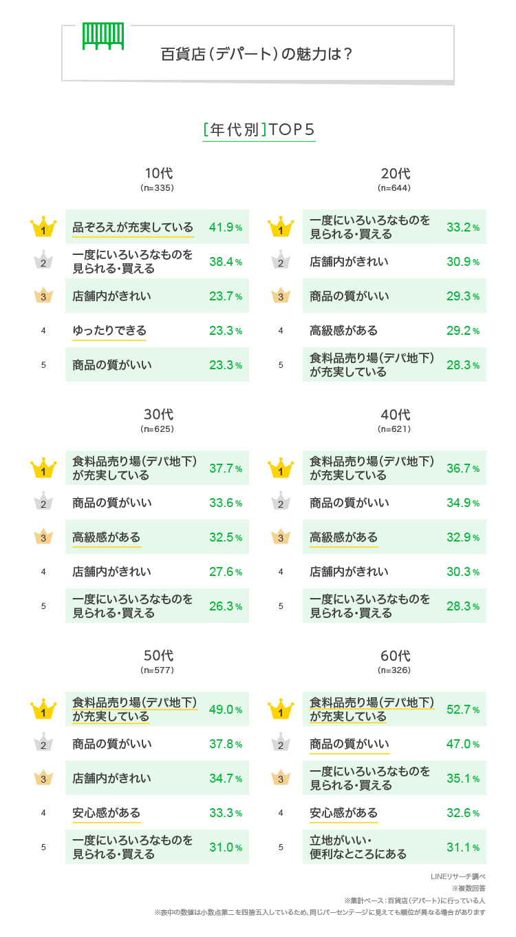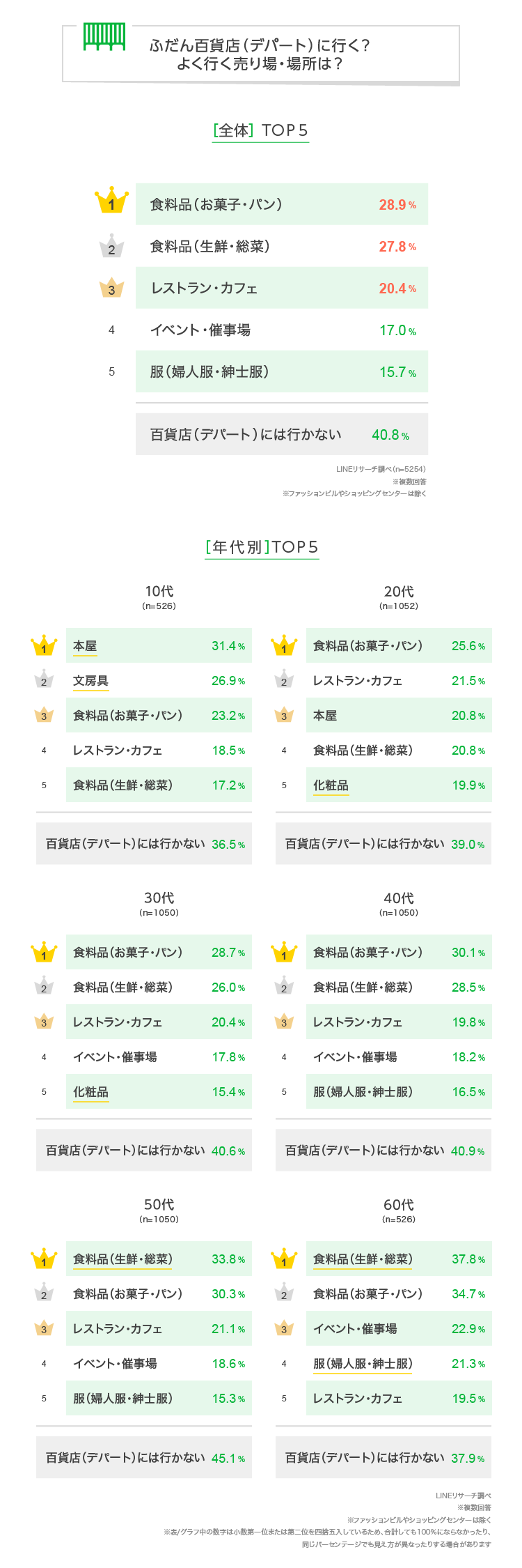 このたびLINEリサーチでは、日本全国の男女を対象に、百貨店(デパート)でよく行く売り場や場所などについて調査しましたので、その結果をお知らせいたします。