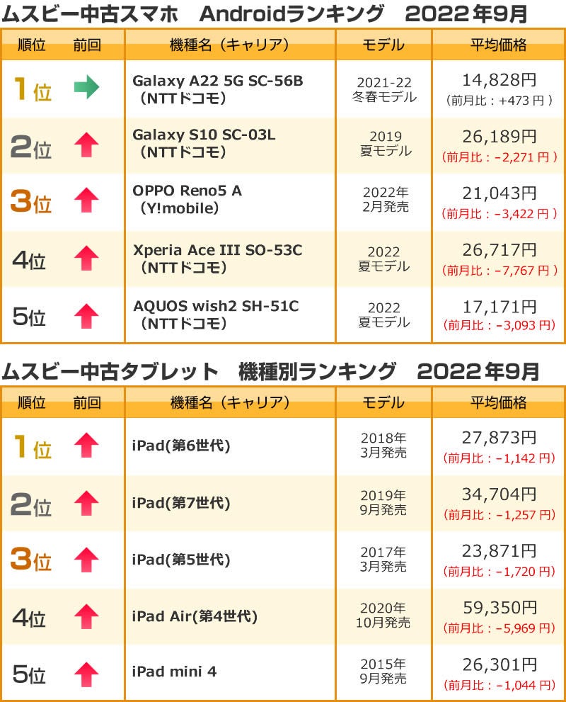 株式会社ウェイブダッシュ(本社:東京都千代田区、代表取締役 河野 由紀)が運営するフリーマーケットサイト「ムスビー」(https://www.musbi.net/) の2022年9月の中古スマホ・中古タブレットランキングを発表いたします。