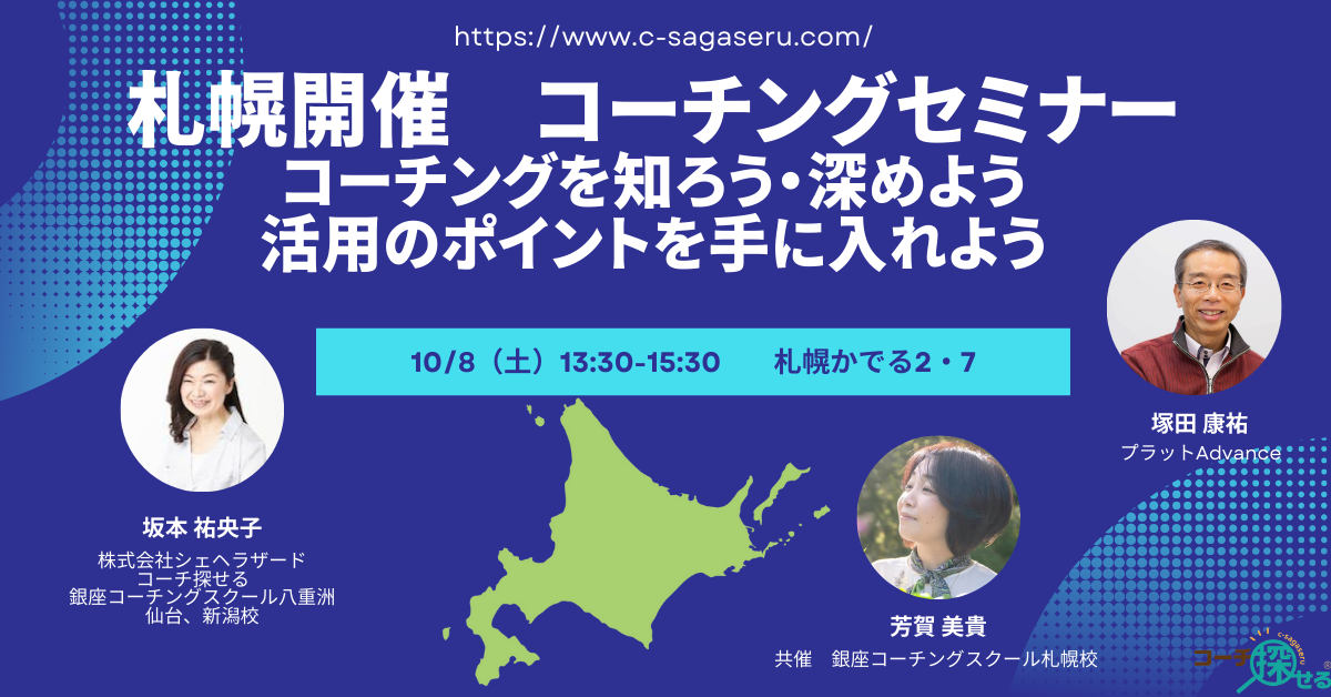 10月8日(土)は、コーチングに興味関心がある方や、企業でのコーチング導入を検討している方、などへ向けて無料コーチングセミナーを、札幌のコーチ育成のプロと一緒に開催します。
