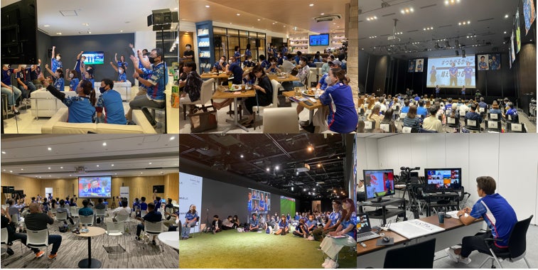 このイベントは9月23日に開催されたキリンチャレンジカップ2022 SAMURAI BLUE対アメリカ代表戦に際し、サッカー日本代表スポンサー各社と連携して行われました。ハブ会場となるJFAハウスには総合司会の枡田絵理奈さん、スペシャルゲストとして見取り図さんが出演。サポーター会場(全6会場、ハーフタイムのみ8会場)は、一般応募の有無や規模、集合での実施かオンラインかなど、企画はスポンサー各社に委ね、それぞれに元日本代表(鈴木啓太さん、石川直宏さん、岡野雅行さん、鈴木隆行さん、福西崇史さん、巻誠一郎さん、播戸竜二さん、加地亮さん、藤田俊哉さん、水沼貴史さん)が応援サポーターとして駆けつけ、各会場と枡田さん、見取り図さんとの掛け合いでイベントを盛り上げました。