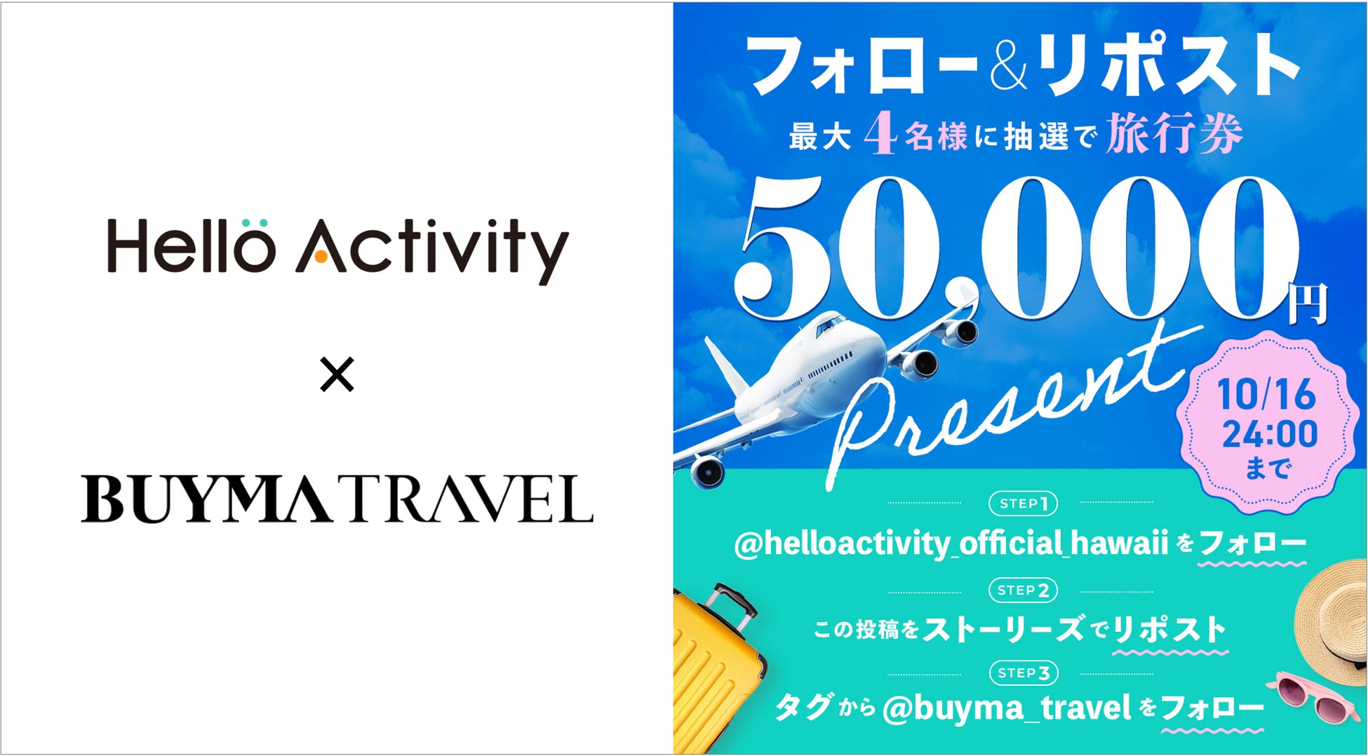 株式会社MEGURU(代表取締役:上原嗣則、本社:東京都千代田区)が運営する旅行者と国内外のアクティビティ主催会社を直接つなぐトラベルマッチングプラットフォーム『Hello Activity(ハロアク)』は、株式会社エニグモ(代表取締役最高経営責任者:須田将啓、本社:東京都港区、東証プライム:証券コード 3665)が運営するプライベートツアー予約サイト『BUYMA TRAVEL(バイマトラベル)』と共同で、2022年10月3日〜10月16日の期間中、最大4名様に5万円分の旅行券が当たるキャンペーンを実施いたします。