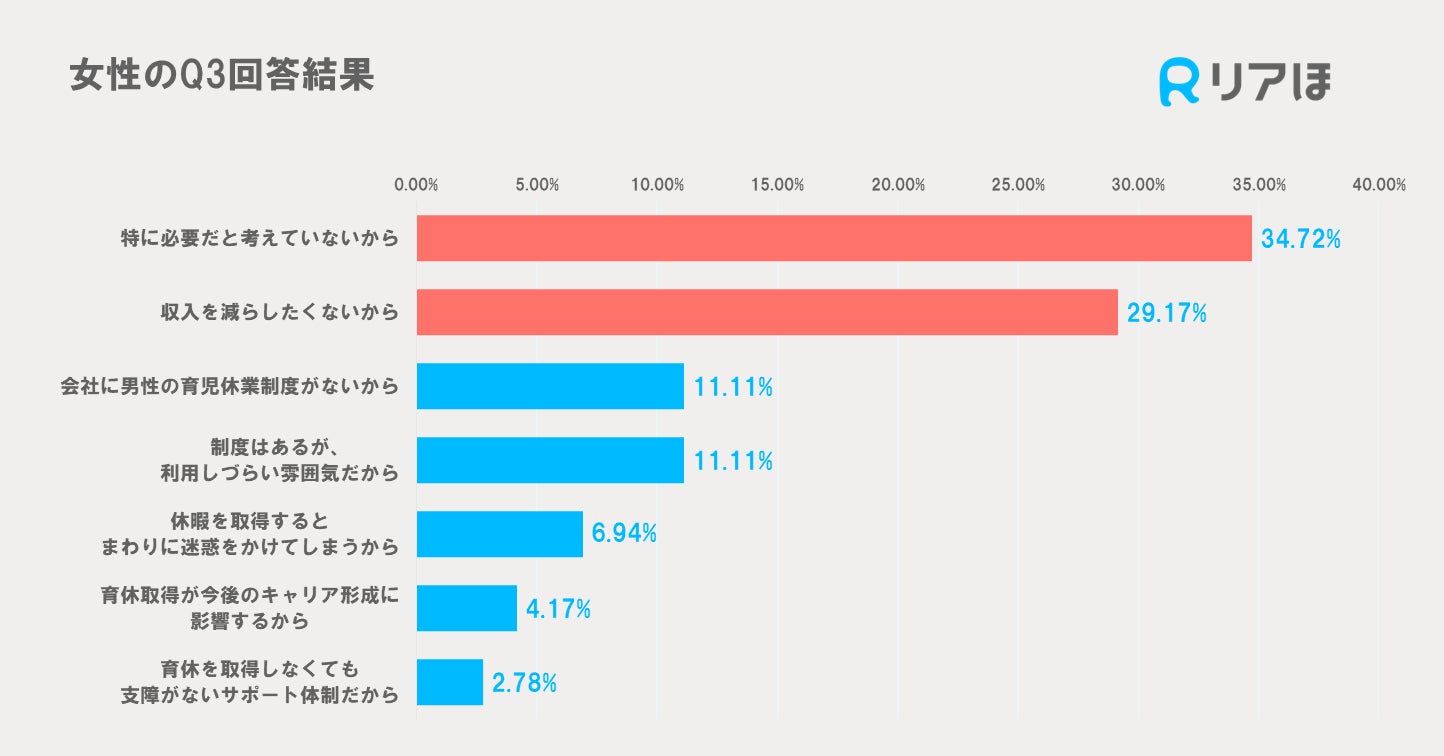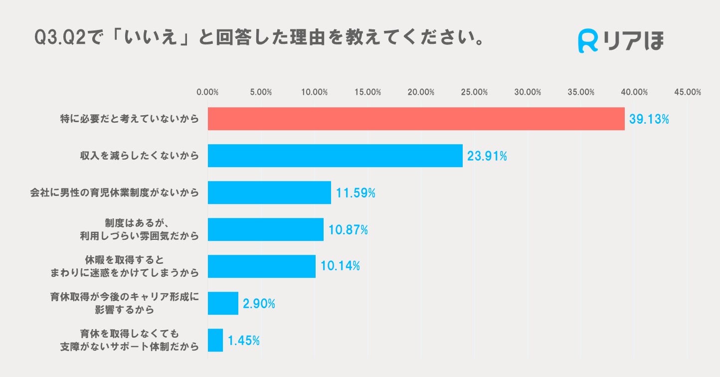 Q2で「次回出産時にパパが育休取得する予定はない」と回答した方にその理由を質問したところ、「特に必要だと考えていないから」と回答した方が一番多く39.13%、次いで「収入を減らしたくないから」が23.91%となりました。「会社に男性の育休業制度がないから」と回答した方は11.59%となり、制度の導入ができていない企業も一定数あることが伺える結果となりました。