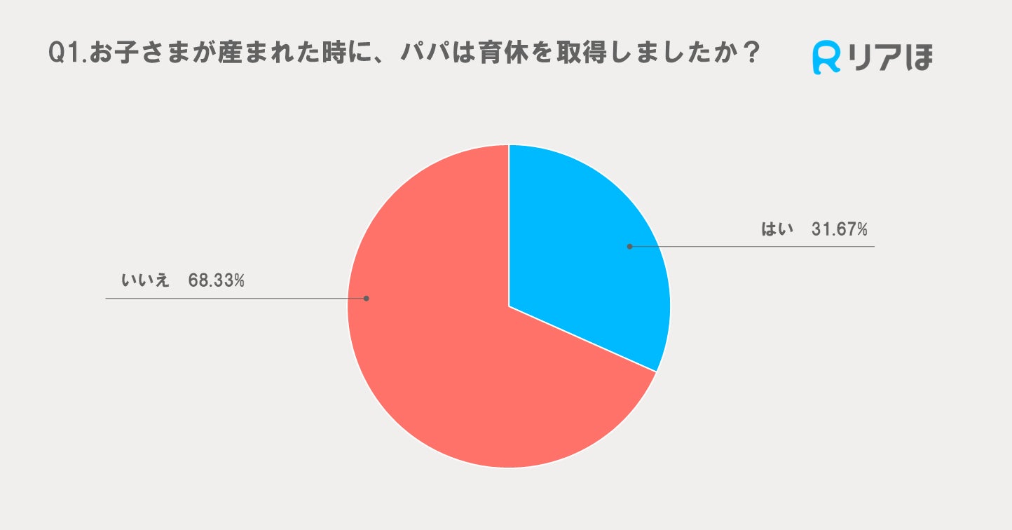 20~30代のパパママを対象に、お子さまが産まれた時のパパの育休取得率について質問したところ、「パパが育休を取得した」と回答した方が31.67%、「取得していない」と回答した方が68.33%となりました。