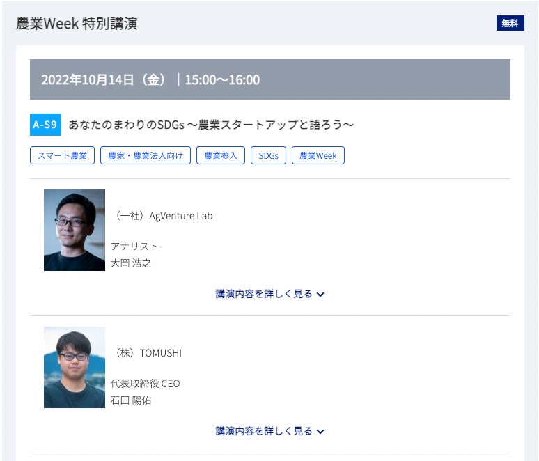 一般社団法人AgVenture Lab(本社:東京都千代田区、代表理事:荻野浩輝、以下:AgVenture Lab)は運営するJAアクセラレータープログラムで採択した農業に関わるスタートアップ企業4社の代表と「あなたのまわりのSDGs 〜農業スタートアップと語ろう〜」をテーマとした1時間のパネルディスカッションを行います。当社の代表の坪井はその内の1社として登壇します。