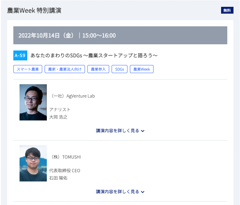 一般社団法人AgVenture Lab(本社:東京都千代田区、代表理事:荻野浩輝、以下:AgVenture Lab)は運営するJAアクセラレータープログラムで採択した農業に関わるスタートアップ企業4社の代表と「あなたのまわりのSDGs 〜農業スタートアップと語ろう〜」をテーマとした1時間のパネルディスカッションを行います。当社の代表の坪井はその内の1社として登壇します。