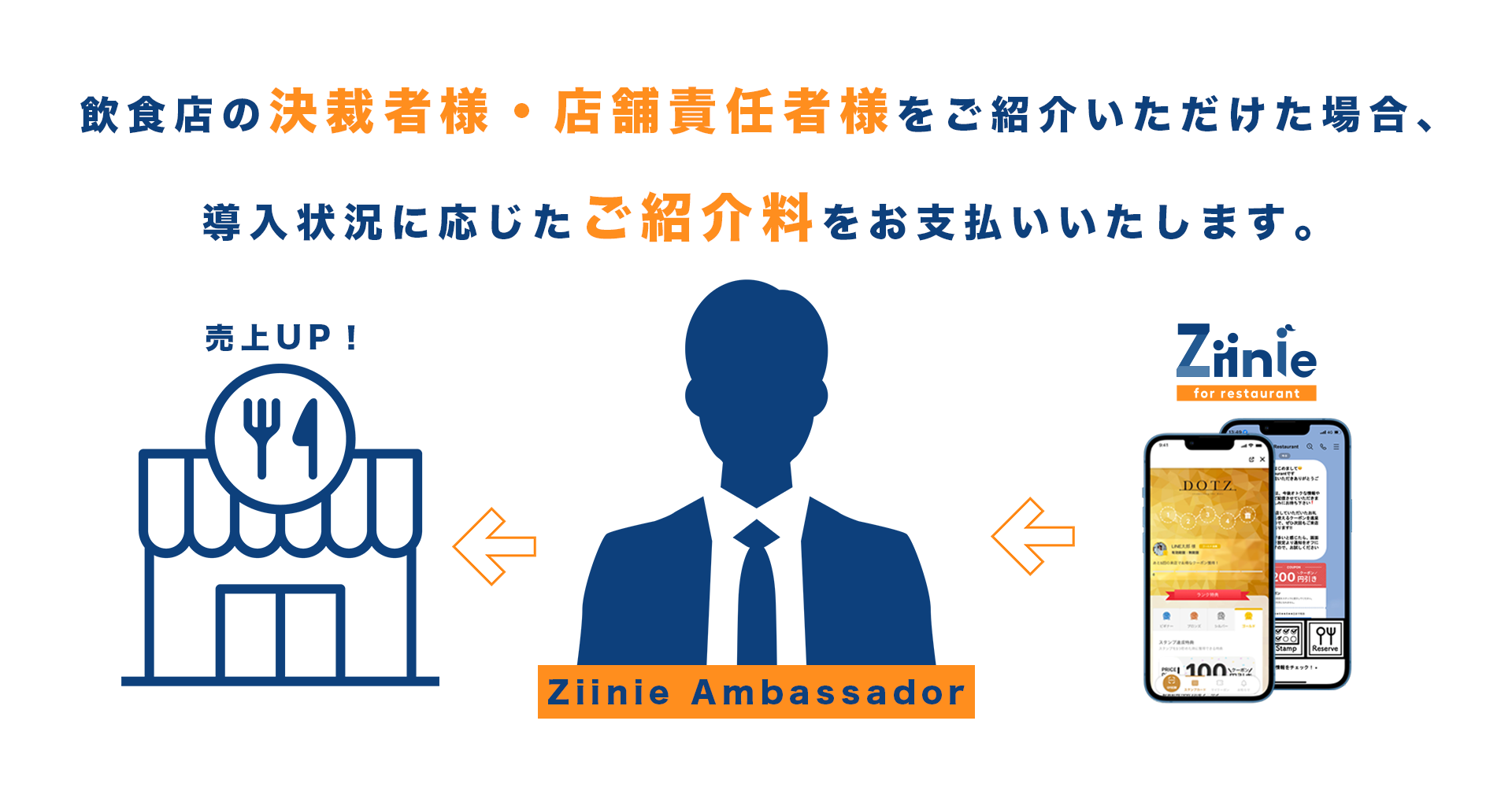 アンバサダーとなった方には、飲食店のリピーターを増やすLINE自動運用ツール「Ziinie(ジーニー) for Restaurant」の魅力を、飲食店の決裁者・店舗責任者様に紹介する役割を担っていただきます。ご紹介いただいた結果や、導入状況に応じてご紹介料をお支払いいたします。