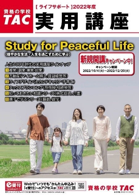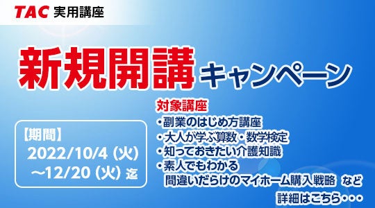 資格取得に向けた教育サービスを展開しているTAC株式会社(東京都千代田区、代表取締役社長:多田 敏男)では、人生100年時代に起こりうるさまざまなライフイベントに備えるための「実用講座」の申し込みを本日10月4日(火)より開始いたします。また、新規開講に伴い、受講料が最大50%OFFになる新規開講キャンペーンを実施いたします。