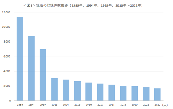 「銭湯」がタウンページデータベースの業種に登場した1989年まで溯って比較すると、1989年(11,374件)から2022年(1,700件)の33年間で、なんと15%にまで減少してしまいました。<図3>