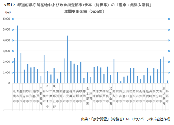 1世帯あたりの「温泉・銭湯入浴料」支出年間金額(2020年)は、全国平均1,243円に対し、トップの青森市では4倍以上となる5,392円。青森県の大人入浴料金は450円なので、月約1回は公衆浴場を利用している計算です。2位は金沢市(4,434円)、次いで盛岡市(2,835円)が3位にランクインしました。<図1>