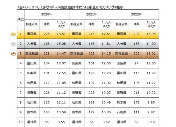 以上の結果から、温泉・銭湯に日本一お金をかけるのは青森市、人口当たりの入浴施設の登録件数が多いのは青森県という結果となりました。