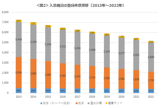 また、バブル期などの一時的なブームを経て、今や国民的レジャーとして定着した温泉も、この10年間で登録件数は減少しており、入浴施設全体が減少傾向となっています。<図2>