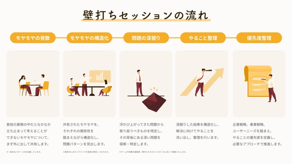 ゆめみでは、クライアント企業のDXや内製化支援に携わる中で、立ち上げに大きな計画と事前承認を必要とするプロジェクトや特定の小さな事業推進ニーズを満たすスポット型の支援だけではカバーしきれない潜在的な課題があると感じていました。頭の中だけでモヤモヤと言語化しきれていない事業・組織課題は、フラットかつ専門的な視点を持つ第三者と壁打ちをすることで、足りない視点を補完し、次に取るべきアクションが明らかになるアプローチになると考えています。