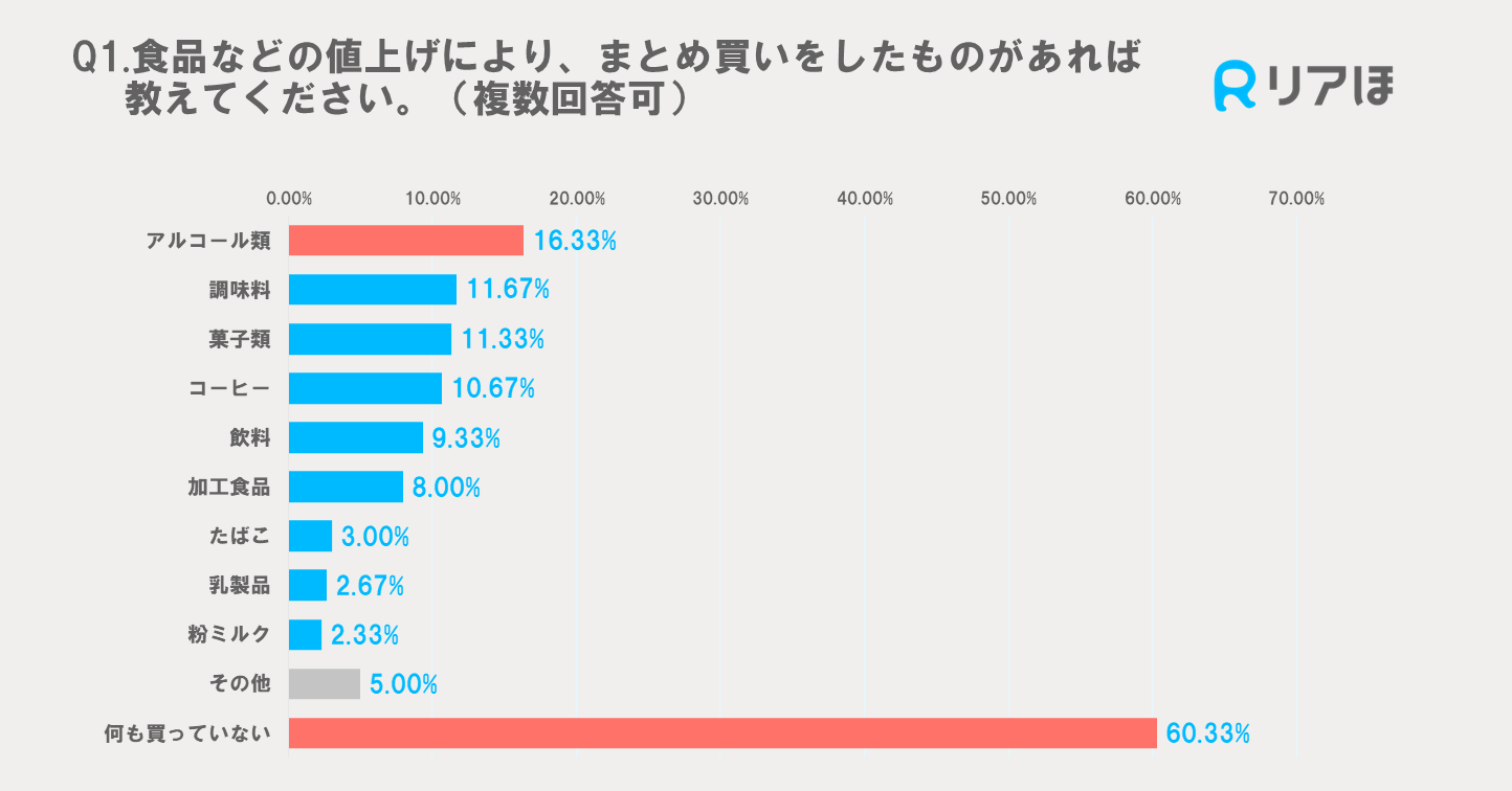 20~40代の既婚男女を対象に、値上げによるまとめ買い品目を質問したところ、「アルコール類」が一番多く16.33%となりました。一方で60.33%の方がまとめ買いはしていないと回答し、値上げ前のまとめ買いをした方の割合は40%以下にとどまりました。