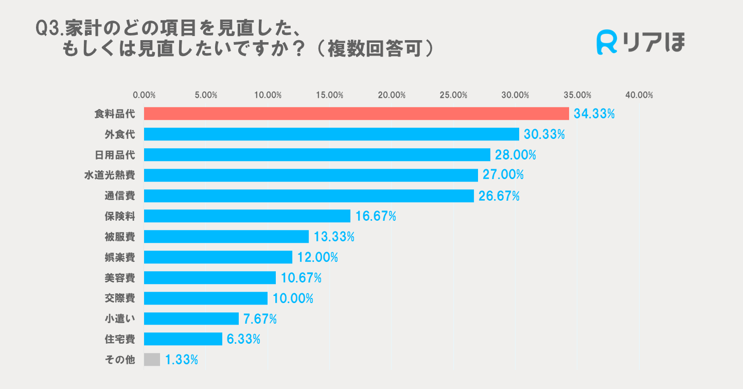 Q2で「既に見直した」、「まだ見直していないが、したいと思っている」と回答した方に見直しをした、もしくはしたい項目を質問したところ、値上げによる家計へのダメージが大きい「食料品代(34.33%)」「外食代(30.33%)」と回答した方が多く、一方で携帯やインターネット等の通信費など、固定費の見直しで変動費増のバランスを取る方も多く見られました。