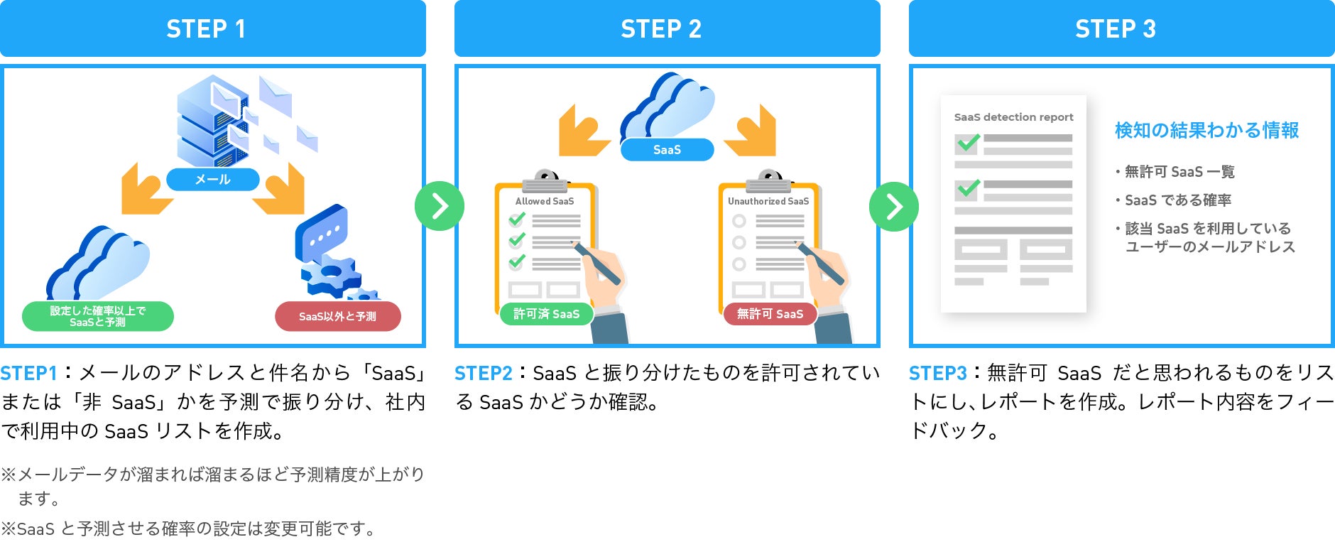 今回提供を開始したサービスは、シャドーIT対策を進めているお客さまから「何から始めたらいいのか分からない」「始めるまでの準備が大変」「誰がどのSaaSを利用しているか管理出来ていない」などの声をいただき実現したサービスです。より簡単に、そして気軽にシャドーIT対策を始められるよう使用する情報は必要最低限であるメールの「アドレス」と「件名」だけにしました。抽出した社内でご利用中のSaaSリストに関しましてはお客さまに後日フィードバックいたします。