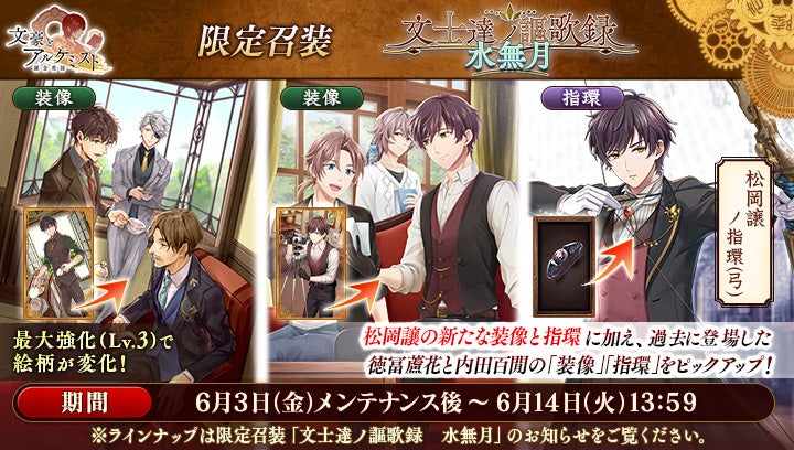 文豪の「衣装」や、会派に装備する事で能力を強化できる「装像」などが入手できるコンテンツ「召装」に、限定召装『文士達ノ謳歌録 水無月』が期間限定で登場します。この召装では新しく追加された松岡譲の装像と指環が一定の確率で入手可能な他、過去に登場した徳冨蘆花、内田百閒の装像、指環などを入手できます。