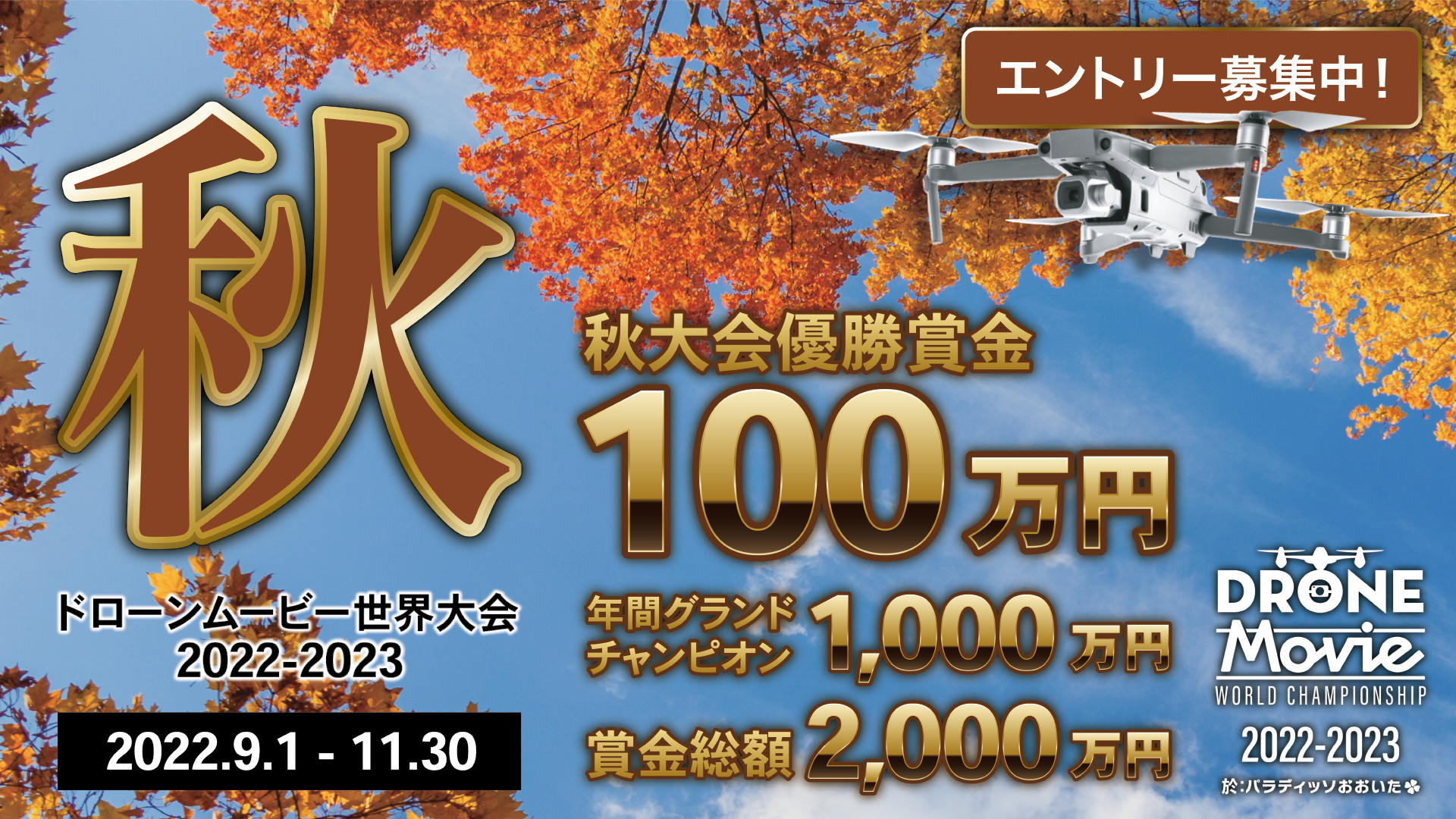 秋大会の優勝賞金は100万円!さらに年間グランドチャンピオンには1,000万円を授与いたします!賞金総額はなんと2,000万円!190名様に賞金を授与!レンタルドローンの方にも賞金をご用意しておりますので、プロ・アマ・初心者問わず、どなたでもご参加いただけます。